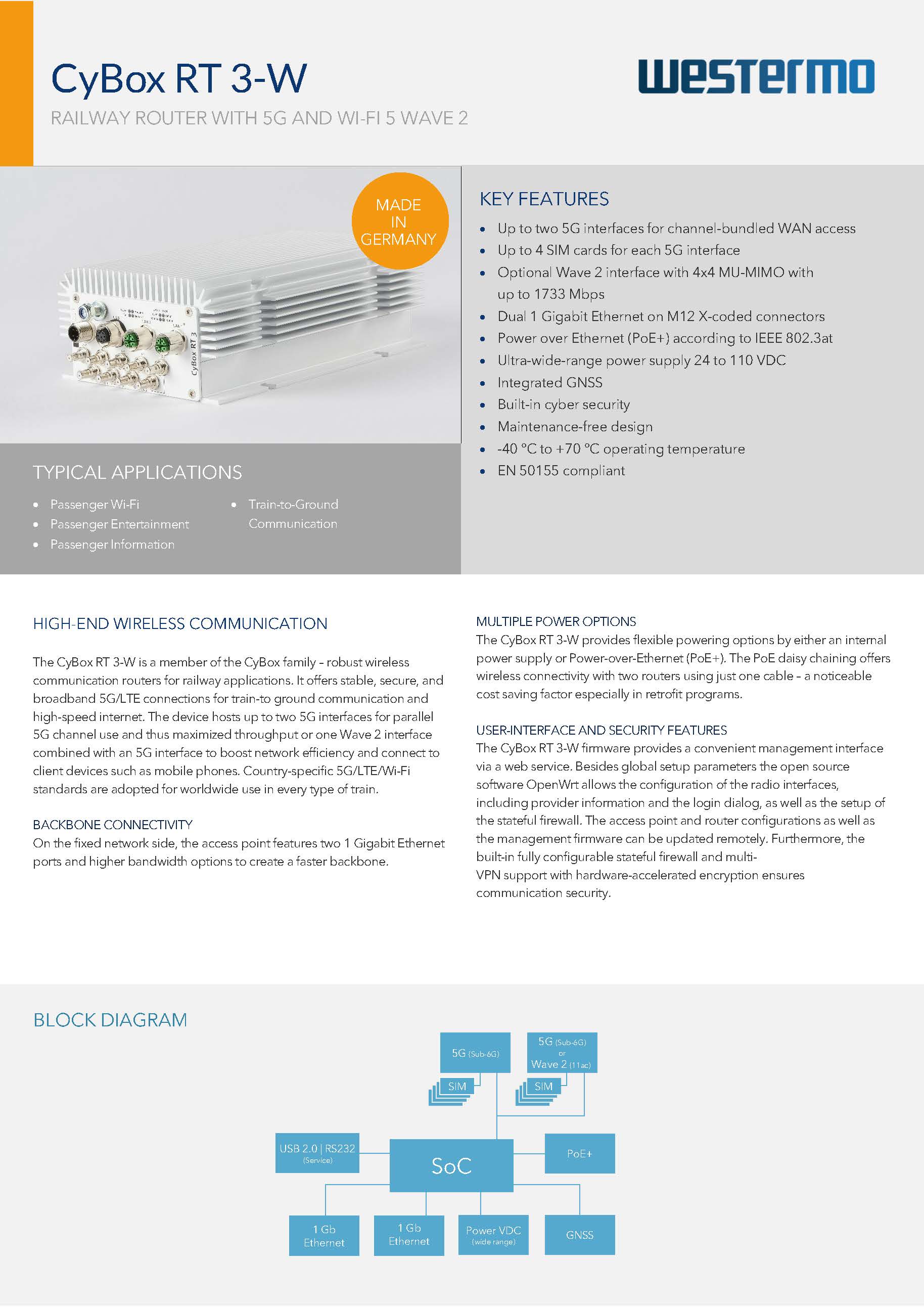 Mobile 5G broadband railway router with optional Wi-Fi 5 Wave 2. Compliant with EN 50155.